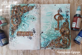 Я смешивала глянцевый гель-медиум с красками разных оттенков зелёного и синего цветов и аккуратно наносила цвет за цветом, предварительно просушивая феном.
